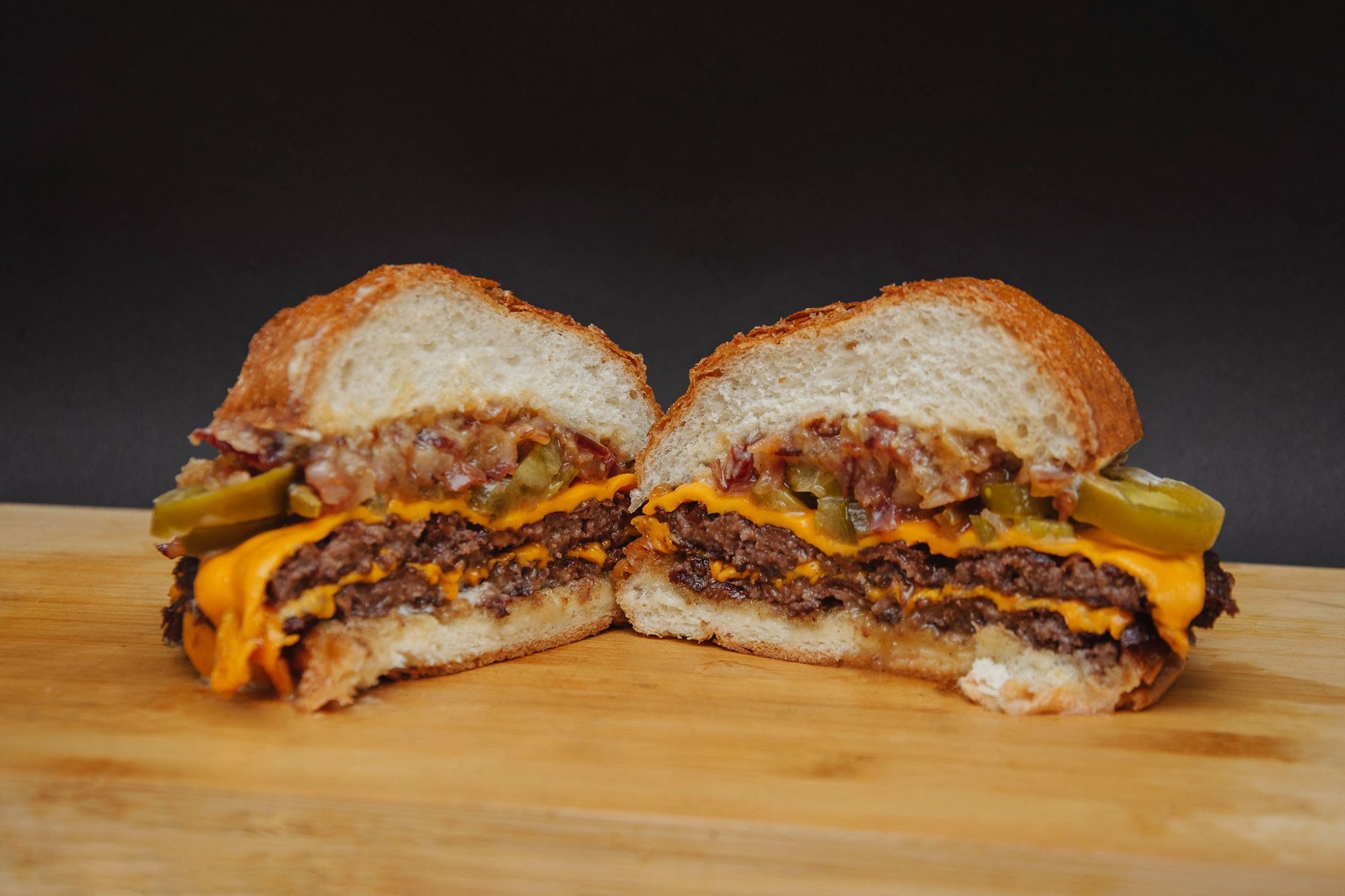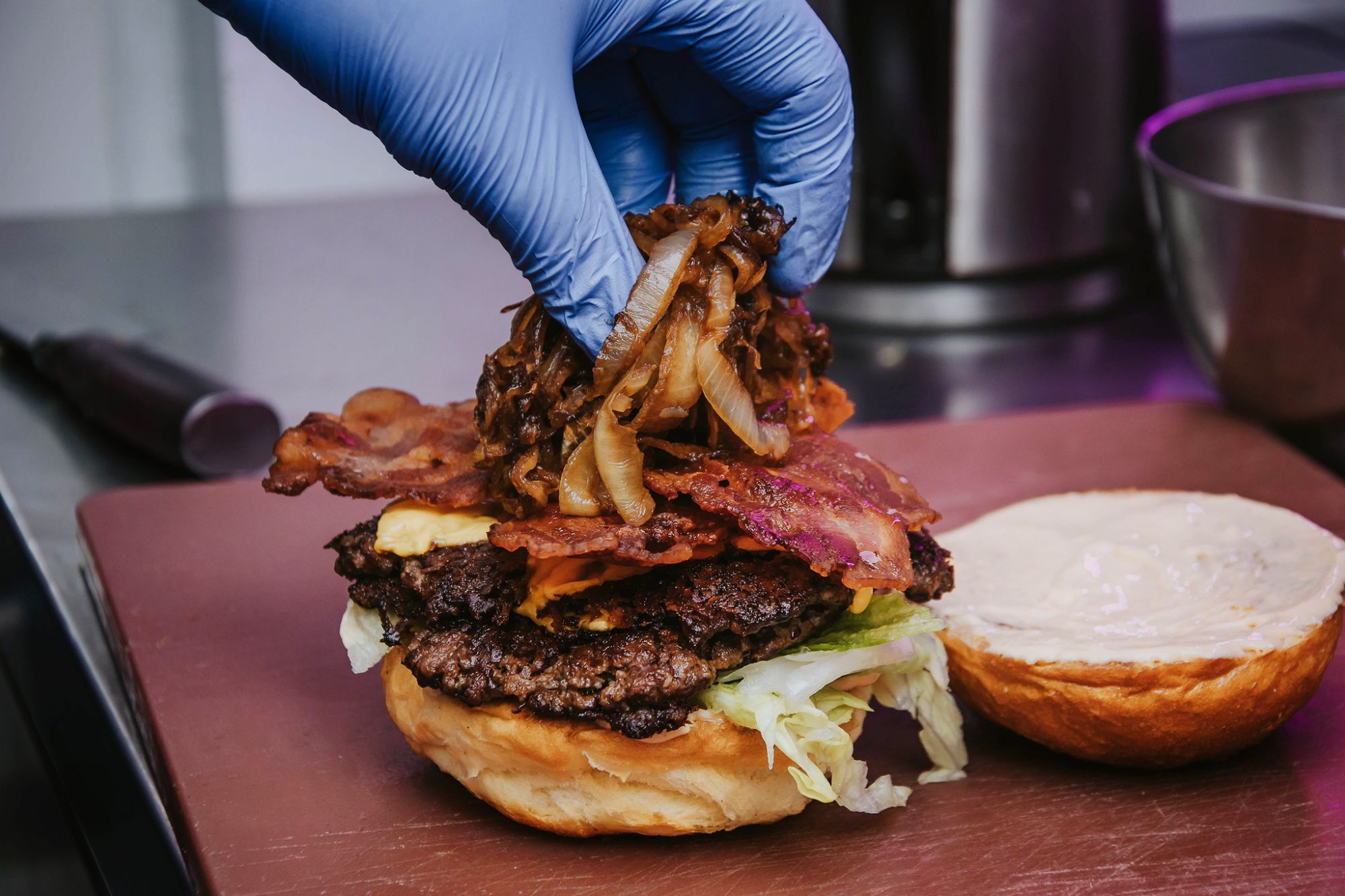 bułka brioszke, sałata lodowa, wołowina, ser cheddar, bekon, pikle, cebula karmelizowana -