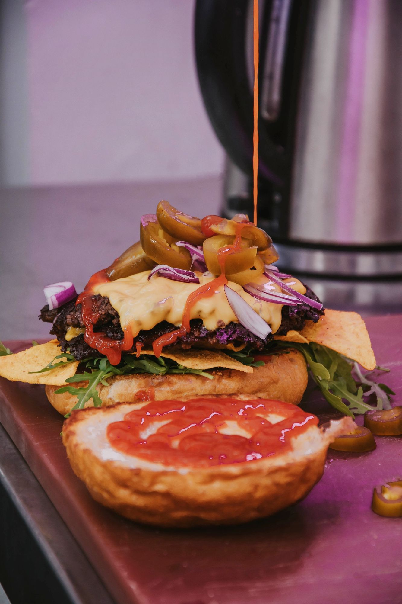 bułka brioszka, rukola, wołowina, ser cheddar, czerwona cebula, jalapeno, ostry nachos autorski z posypką z habanero