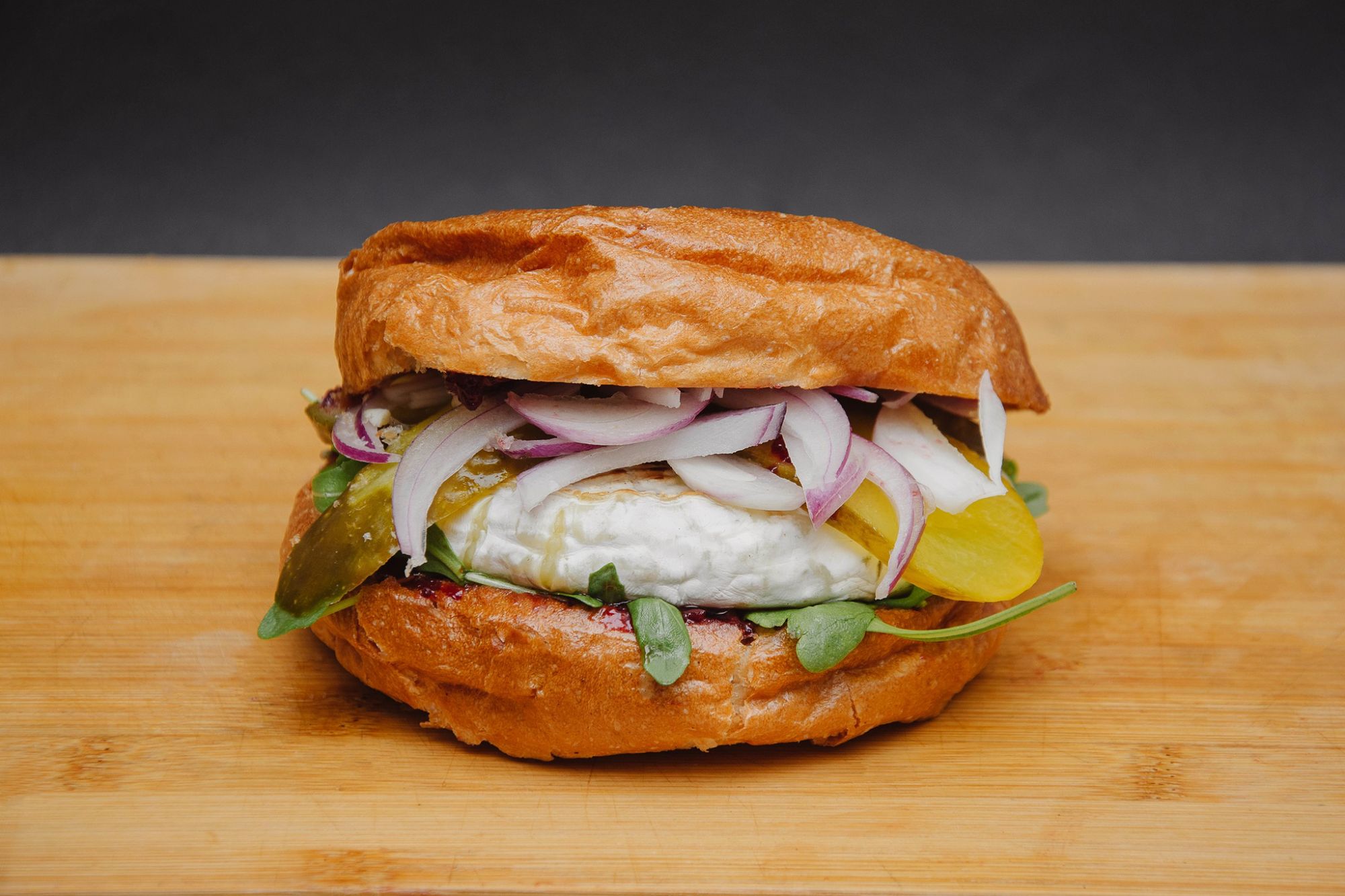 bułka maślana, ser camembert, rukola, czerwona cebula, dżem wiśniowy, pikle -