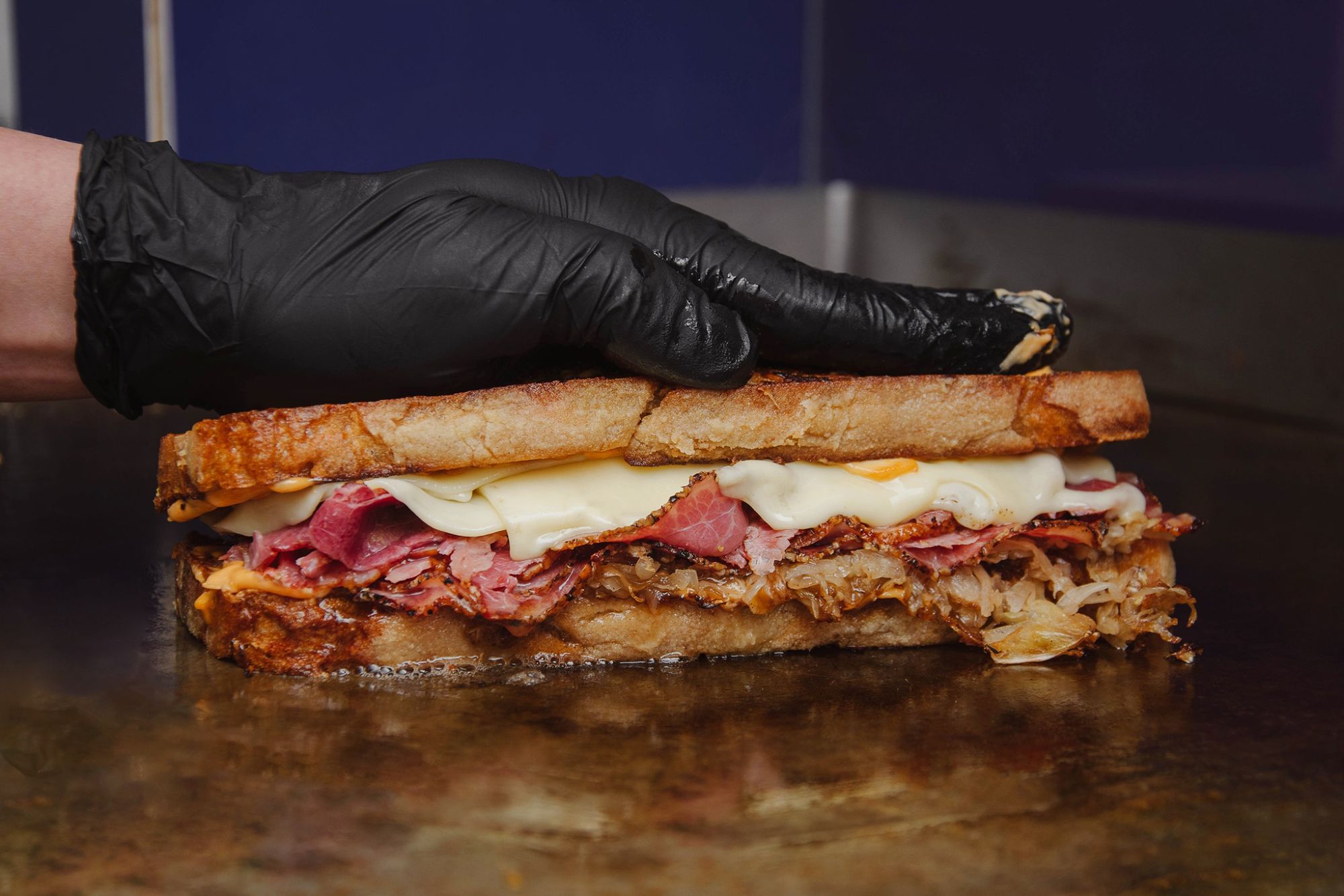 pieczywo żytnie, pastrami, sos rosyjski, kiszona kapusta (podsmażana), ser szwajcarski -